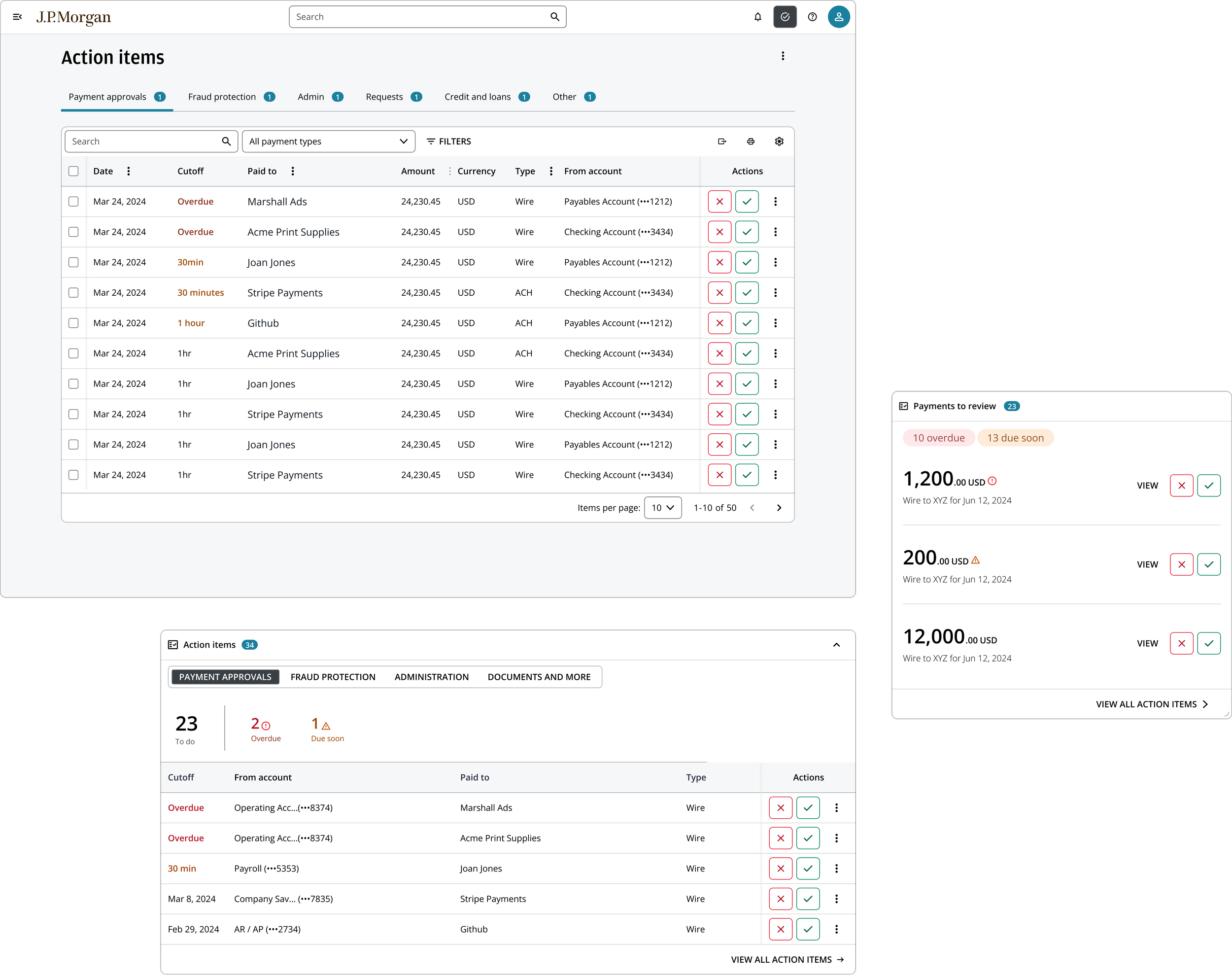 Top left is a dataview of payment approvals in the Action Items page. We collaborated across work streams to ensure consistency because the design system’s pattern had yet to be published. We aligned on tab order, column order, type treatment, button treatment, export flow, and more. The bottom left widget is for Ring’s home page, where the team had to similarly align design across work streams, from column order, to header metrics and more. Finally, the right-hand design for a widget that could live either in the home page or the money movement landing page. It is tailored for users to efficiently approve the most urgent payments. We wanted to show users what they needed first with the option of clicking in for further detail.
