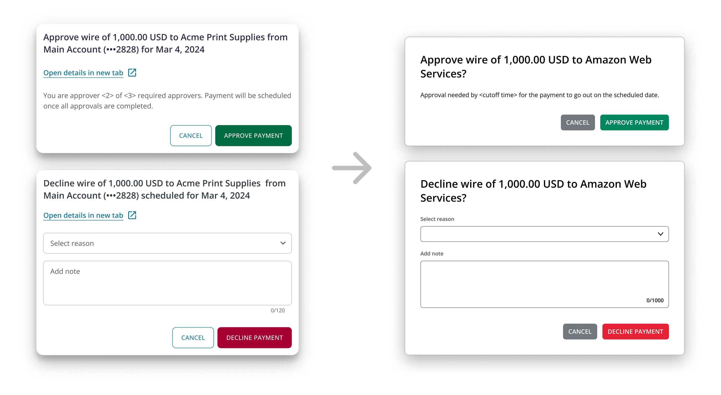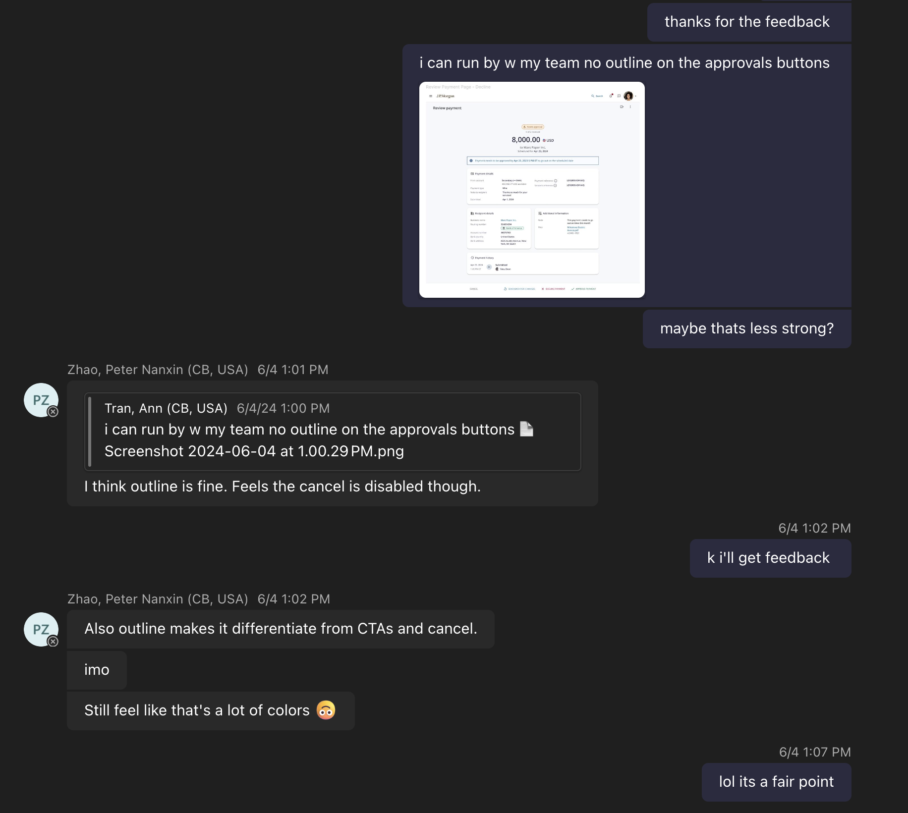 The design team questioned the need for both ‘Decline’ and ‘Send back for changes’ as actions. ‘Send back for changes’ and ‘Decline’ are similar because a reason is already required by users when declining. However, the benefit of ‘sending back’ a payment would be that users wouldn’t have to recreate a payment from scratch, but rather edit the existing template. Ultimately, we agreed to take it to research to ground our perspective.