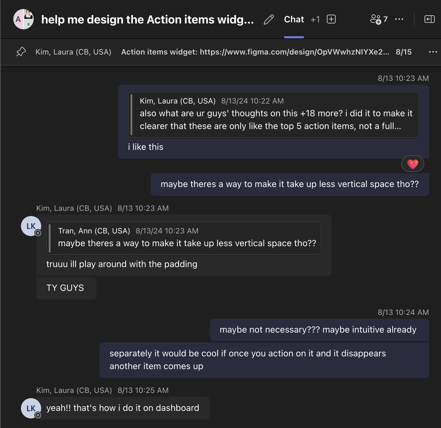 One of the challenges of this work was the continuous collaboration across six design teams responsible for different widget features, different tabs on a consolidated page, or the nascent design system itself. Below are a few examples of the (sometimes chaotic but always valuable!) process of outreach and collaboration. We constantly need to loop ourselves and others in, making sure our experience was consistent, unified and visually streamlined.
