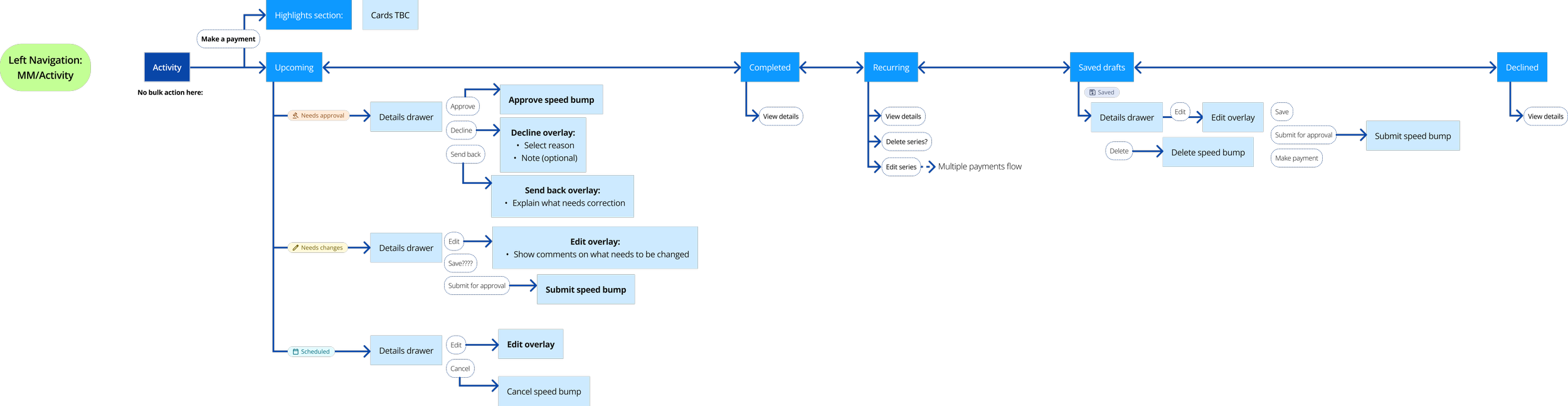 To make sure we had a clear idea of how users could get where, the researcher Tiffany and I worked together to map out every location a user could approve a payment.