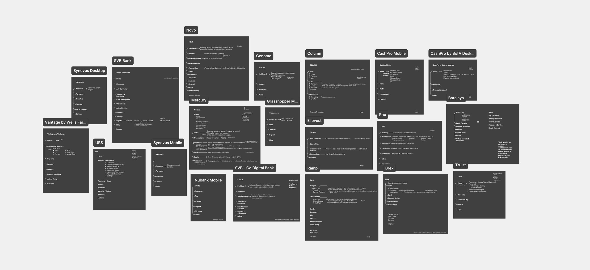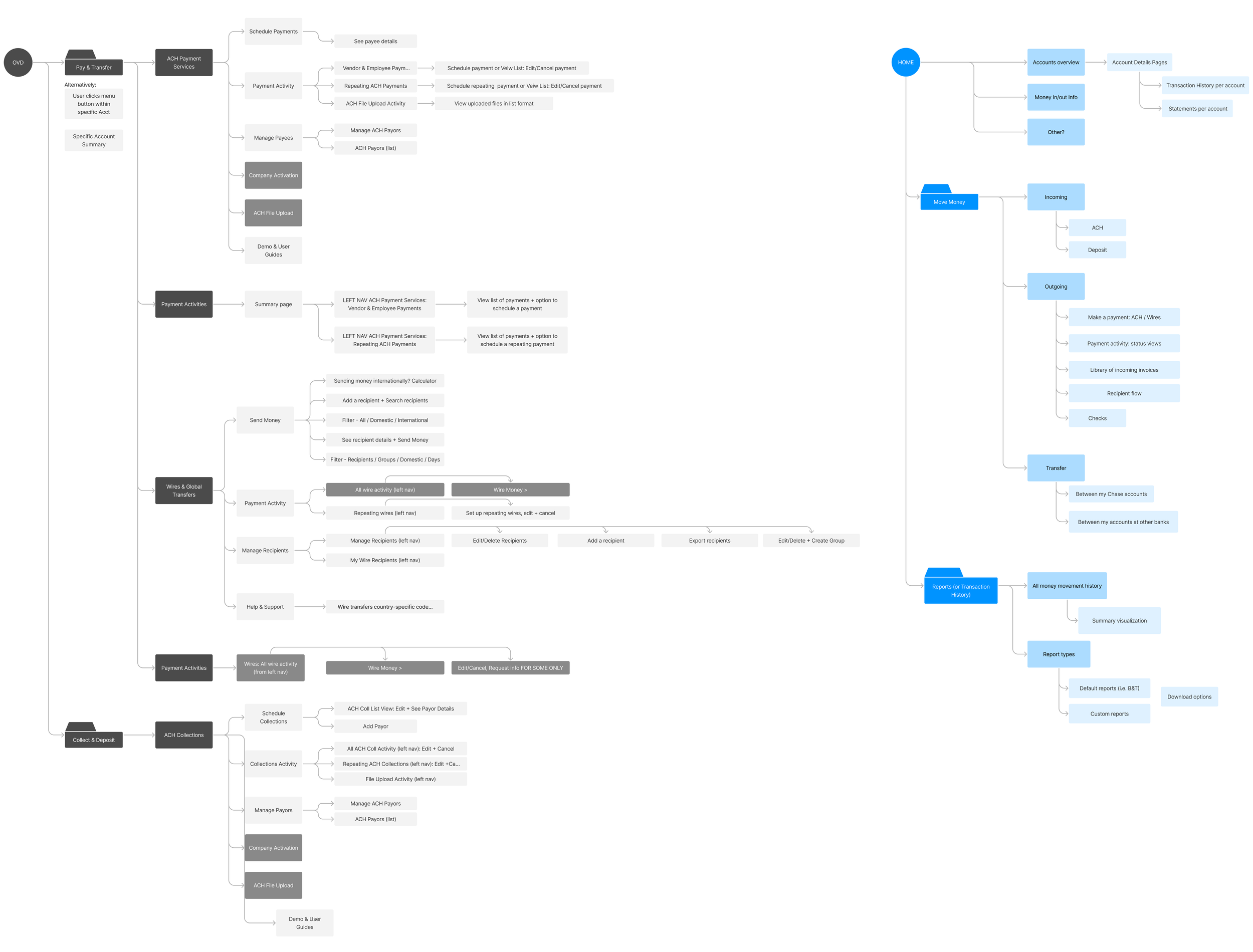We also mapped competitors’ information architecture to build a case for simplifying what’s in Chase Connect. This alongside our heuristic evaluation shaped our proposal for a simplified accounts, payments, and reporting architecture.