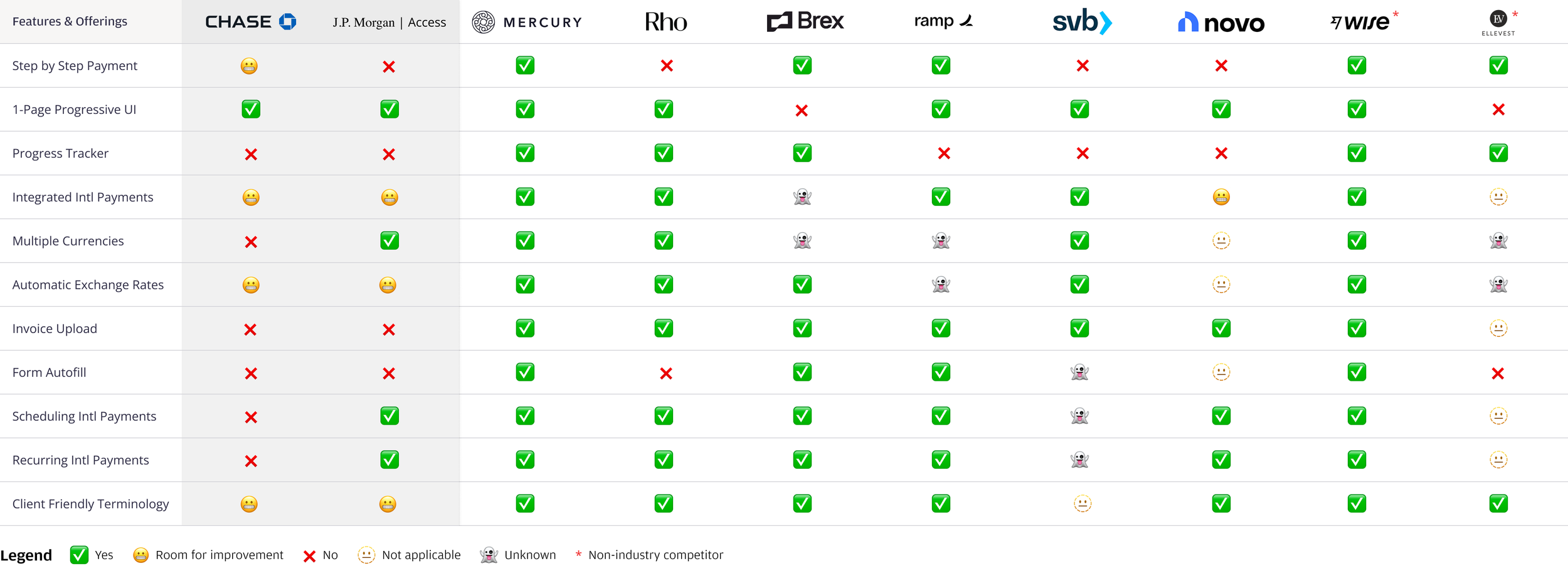 Zooming into making a payment, I created a matrix that compares our competitors to our existing platforms. That way, we could easily flag missing features. This design artifact made an impact for our product partners to triage important features.