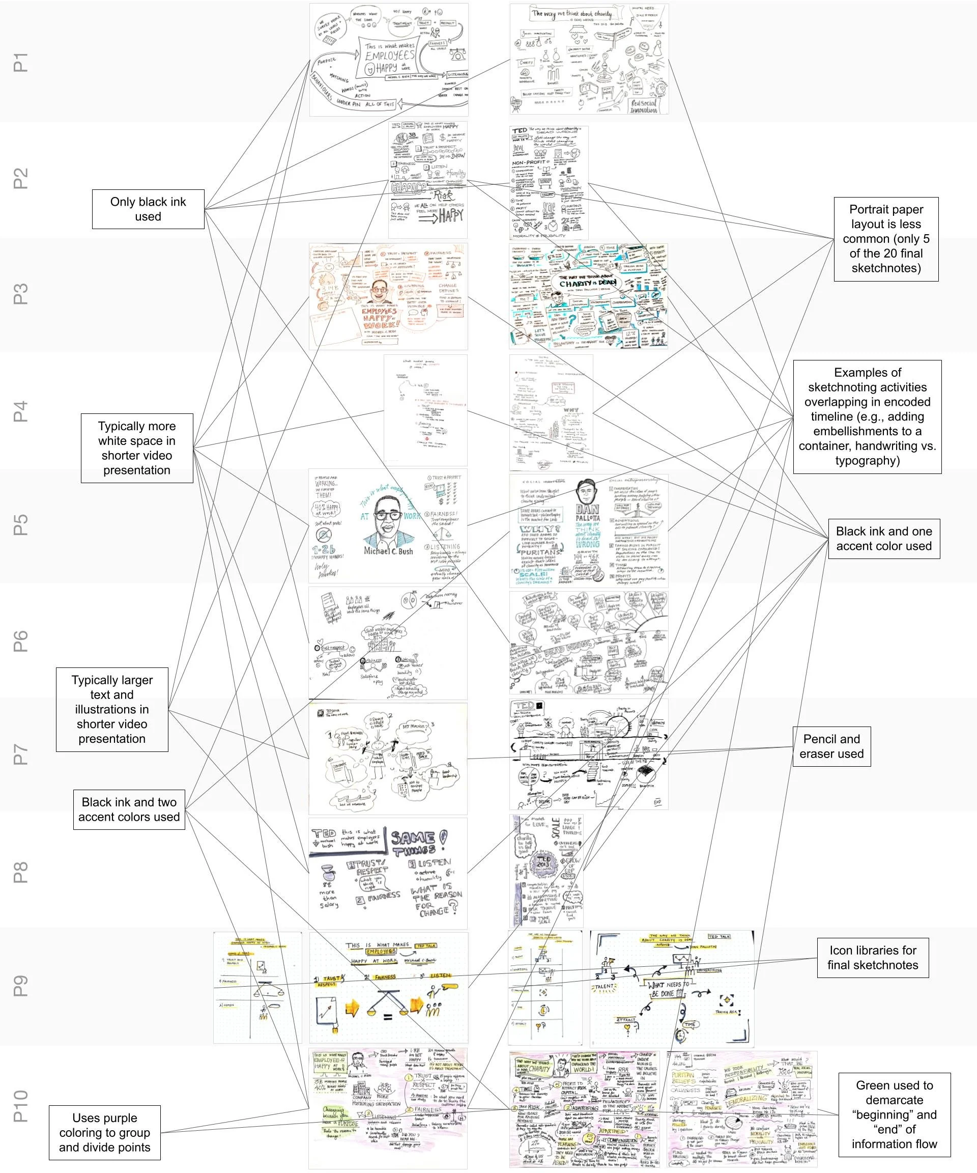 There are several ways that we pulled patterns from participant sketchnotes. Across the research, we focused on the following themes to study: