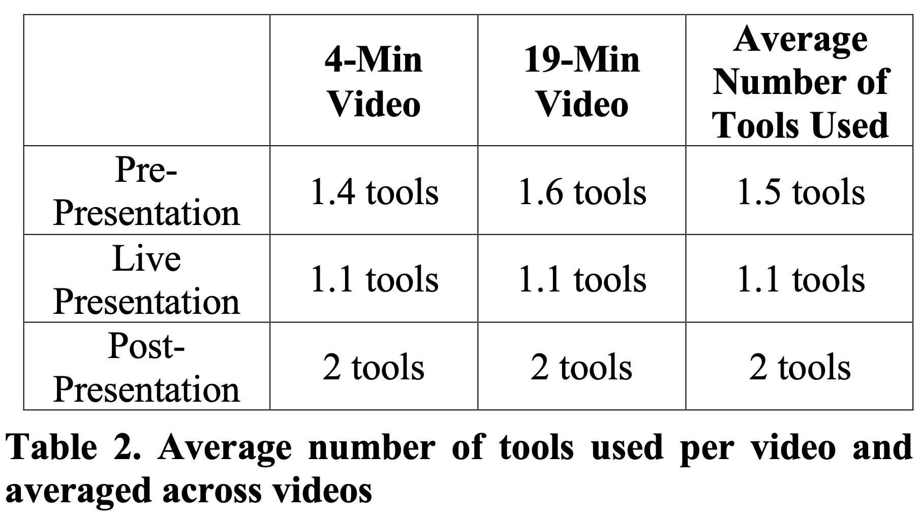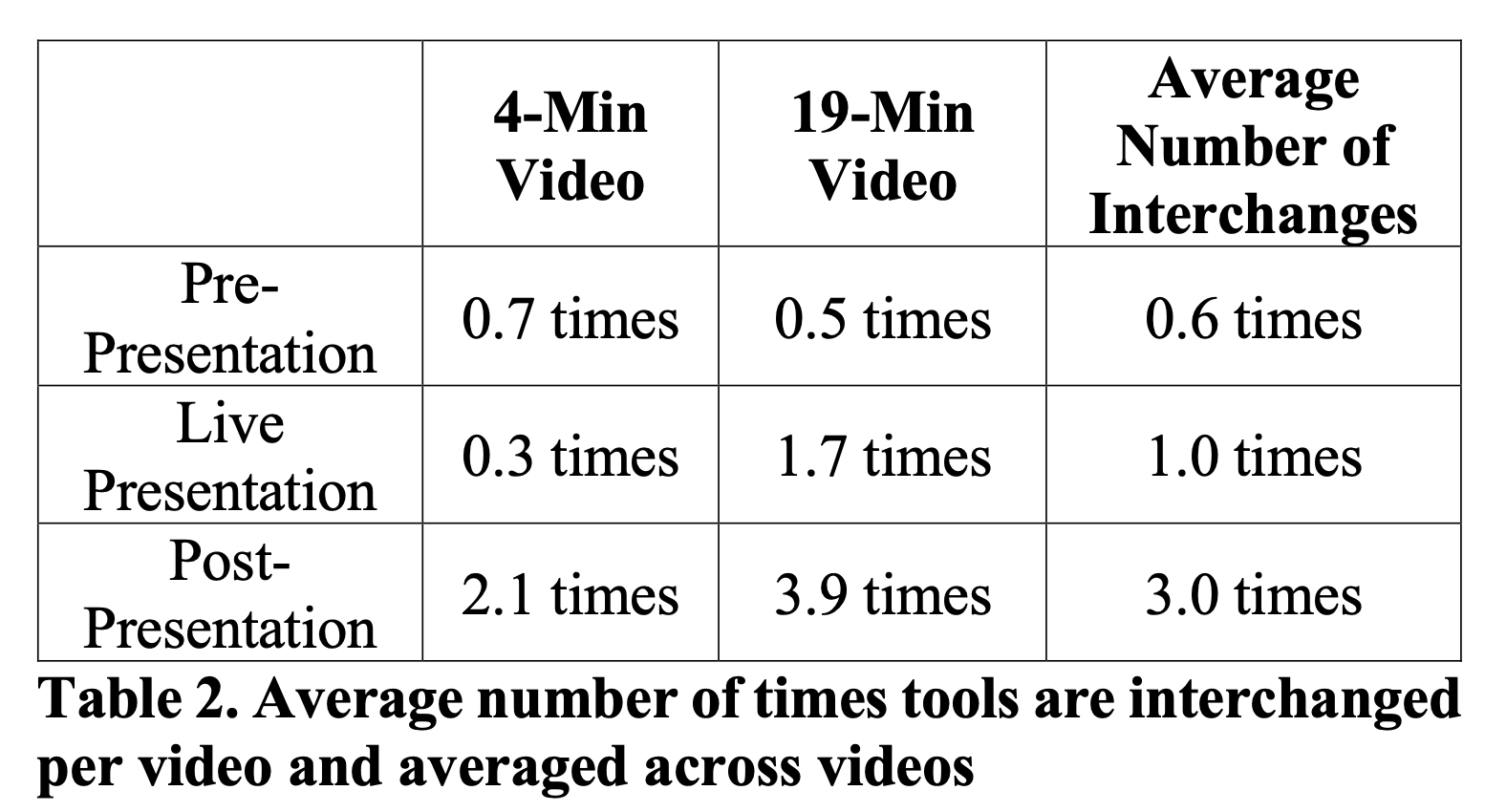 Third, the tools participants used empowered them to take better notes. That being said, participants limited their tools to improve focus and reduce cognitive load. Below are calculations on the number of tools used per video and number of interchanged tools used per video.