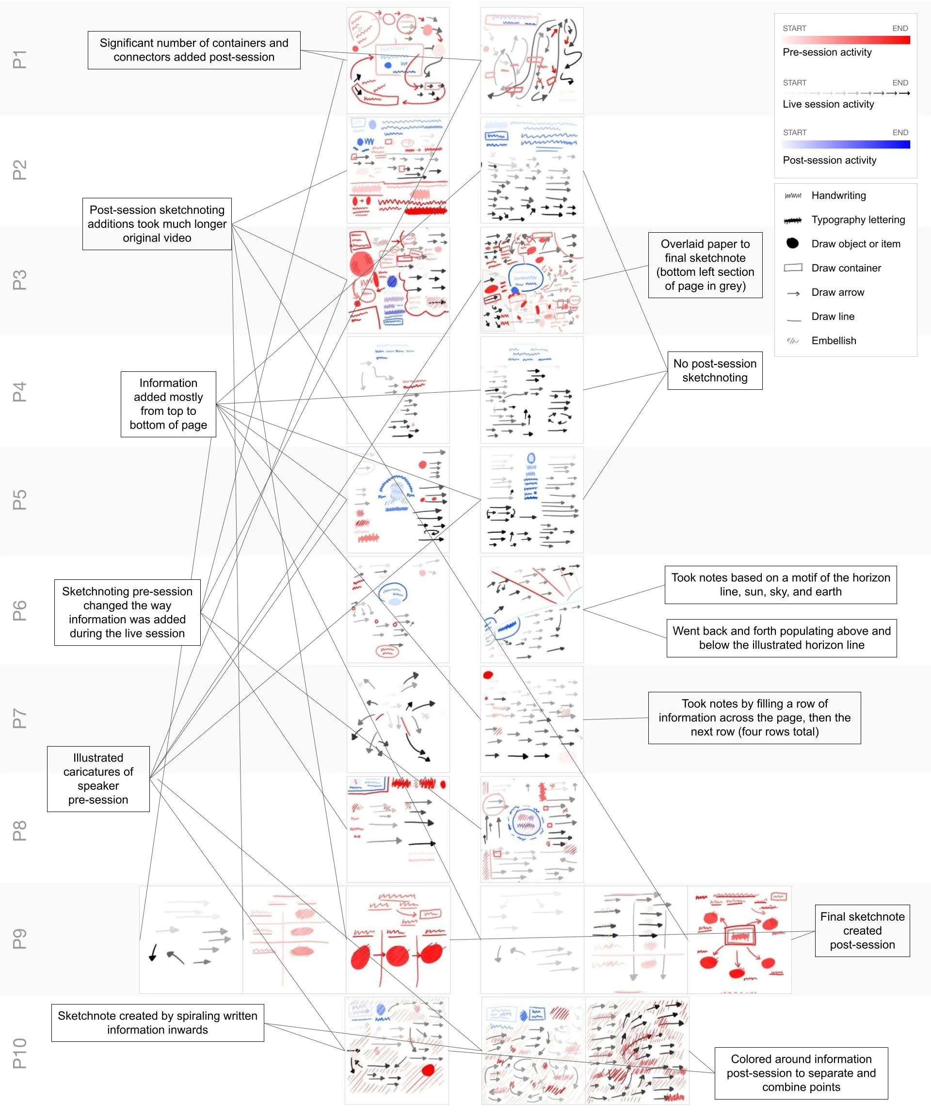 We focused our observations on participants’ real-time sketchnoting activities, especially related to time constraints, visual-spatial processing, and tool applications.