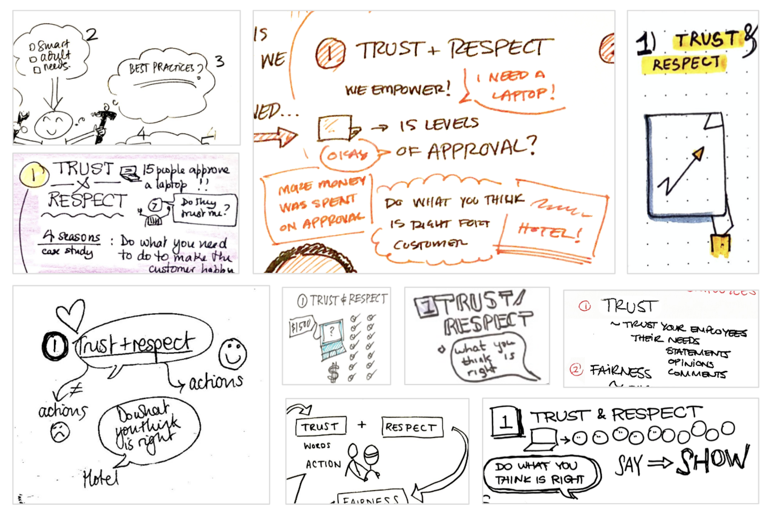 Fourth, participants used a number of techniques to draw out important details. Below on the left you can see P4’s use of iconography and color. On the right, you can see how all ten participants approached emphasizing ‘trust and respect’ differently, through color, type treatment, bolded lines, and containers.
